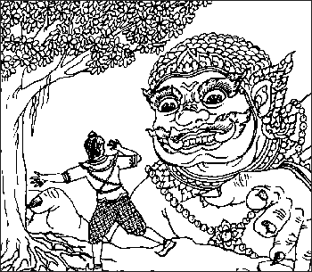 พระราชาควบตามไปทันละมั่งแล้วฟันมันด้วยพระขรรค์ขาดเป็น ๒ ท่อน เพื่อระบายโทสะ ใช้ไม้เสียบคอนไว้ที่ท่อนหนึ่ง ด้วยความเมื่อยล้าจึงเข้าไปเอนกายที่ใต้ต้นไทรต้นหนึ่ง และม่อยหลับไป ที่ต้นไทรนั้นมียักษ์ตนหนึ่งอาศัยอยู่ มันตั้งกติกาไว้ว่าใครเข้ามาอยู่ภายใต้ร่มไทรนี้จะถูกจับกิน มันจึงจับพระหัตถ์ของพระราชาปลุกให้ลุกขึ้นพร้อมที่จะกิน พระราชาเมื่อทราบว่ามันเป็นยักษ์ก็ขอไว้ชีวิตไว้ โดยมอบเนื้อละมั่งตัวนั้นให้ยักษ์กิน และสัญญาว่าจะส่งชาวเมืองมาให้ยักษ์กินเป็นประจำทุกวัน ยักษ์ตกลงตามนั้นพร้อมกับขู่ว่าถ้าหากวันใดไม่มีคนและอาหารมาให้กินจะจับพระราชากินเสีย