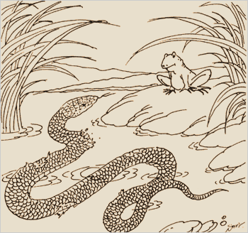 กบเขียวที่นอนอยู่บนหลังลอบได้เห็นเหตุการณ์นั้นโดยตลอด งูปลาเหลือบไปเห็นกบแล้วถามว่า